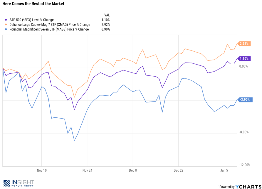 First the good news: this market and economy look strong heading into the new year. In truth, nothing of consequence has changed since our end of year memo, so we don’t need to rehash it. But our favorite new trend in the market continues. The market growth we’ve seen in the last 2+ months has been driven not by super fancy AI names (i.e., the Magnificent 7), but instead by the rest of the market. And that spread continues to widen.