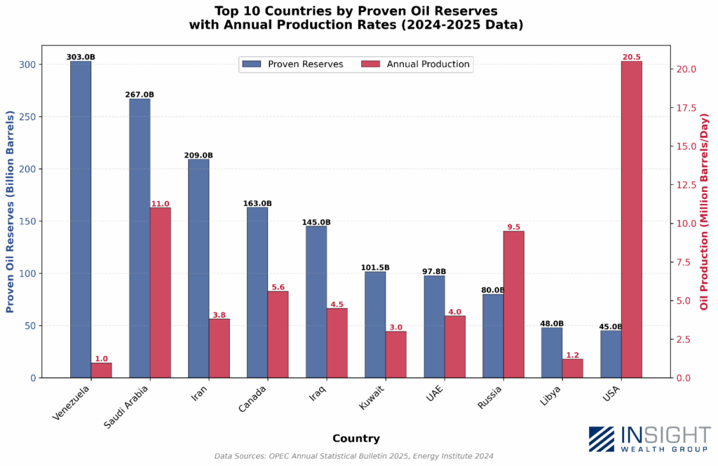 First, let’s address the data on the right side of the chart above. Yes, the U.S. is #10 in proven reserves. And yes, it is #1 (or at least was in 2024) in production by a WIDE margin. But no – we are not about to run out of oil. U.S. oil companies act a bit differently than some of the other big producers (i.e., Saudi Arabia). It has to do with how we account for our wells.