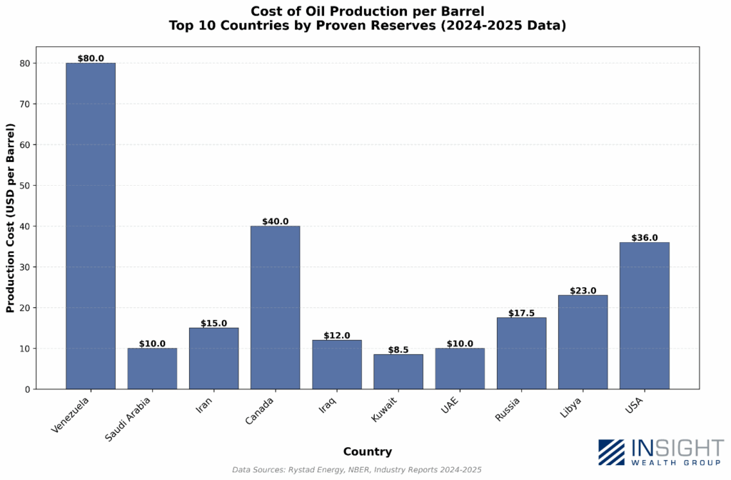Now back to Venezuela. They have huge reserves and they’re now going to be open to U.S. companies. Drill, baby, drill, right?! Not quite. You see, the oil in Venezuela is quite different than the oil we have in the U.S., or Saudi Arabia, or other large producing countries. The oil in Venezuela – especially in the Orinoco Belt – is extremely “heavy” or as one reporter said this week “highly viscous and dense.” That makes it hard to get out of the ground and expensive to refine. As such, Venezuela’s cost of production is significantly higher than the rest of the big oil producing countries.