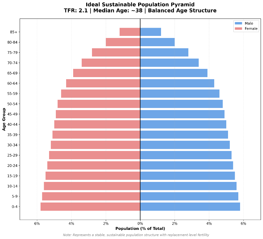 Assuming existing mortality rates, a TFR of 2.1 creates a population pyramid that looks like this: