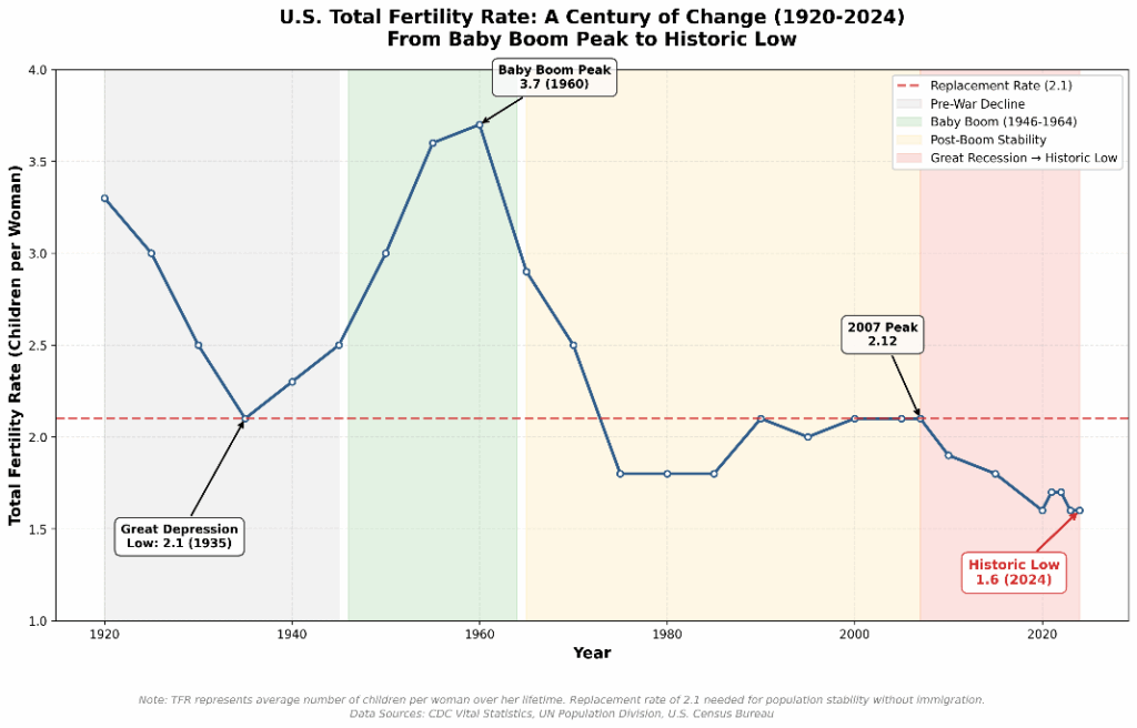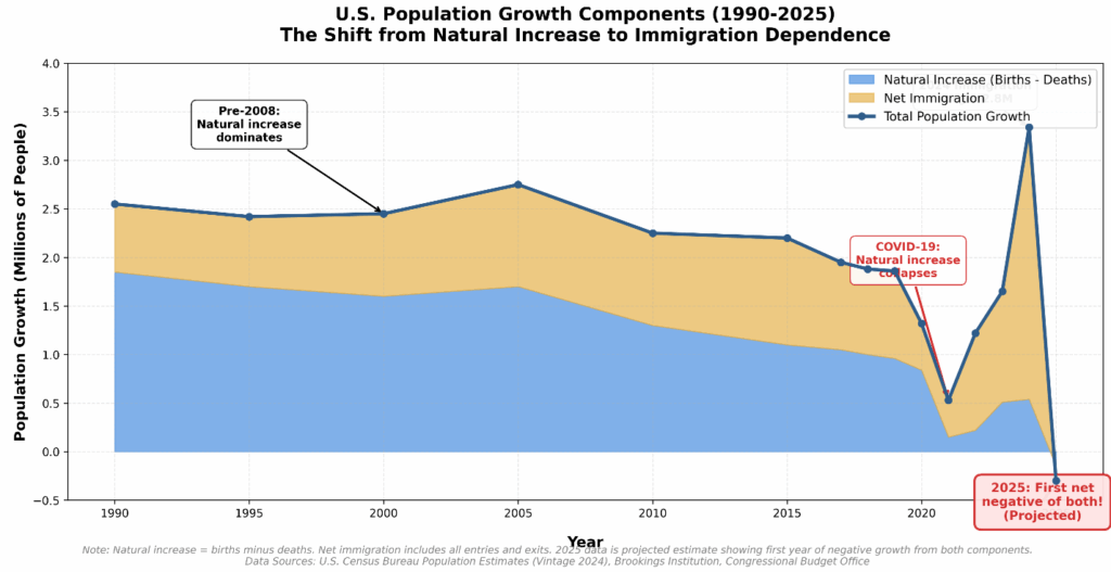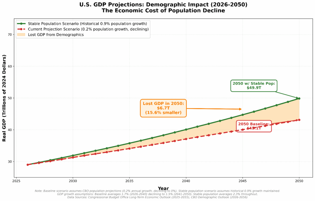 And it really accelerated in 2025. Initial estimates say our deaths exceeded births by 150,000 last year. And early estimates suggest we may be experiencing net negative migration for the first time since the Great Depression. That means our population is likely shrinking.