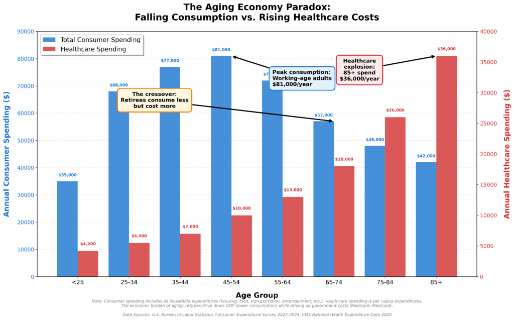 An aging population is a double whammy. Older adults spend less than working age adults. But they draw more from the system – especially in healthcare costs.