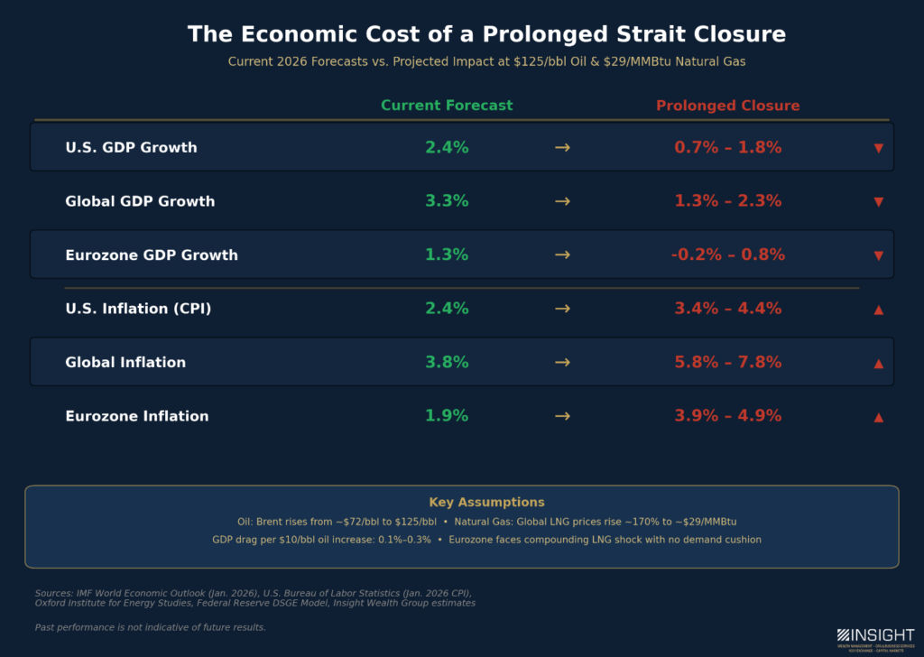 The easy number is what we’ve said many times before: 20% of the world’s oil supply flows through the Strait of Hormuz. The impact on the global economy depends almost entirely on how long it stays closed. Analysts estimate a short-term closure would drive prices up to $80 – $100 per barrel. A longer-term closure (think more than two weeks) would drive prices higher with estimates falling in the $110 – $130 per barrel.