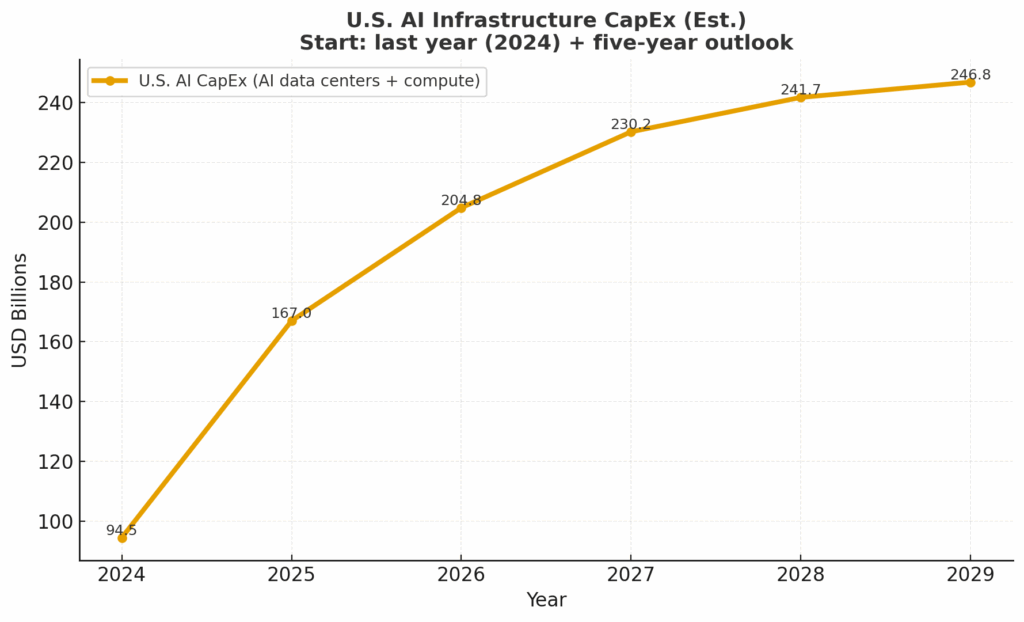 Tsai isn’t wrong. And just because he’s criticizing it, it doesn’t mean Alibaba isn’t doing it, too. They’re investing $52 billion over the next three years. But that pales in comparison to Meta, Microsoft, Google, and Amazon. They’re expected to spend $320 billion this year on data centers and other AI capex (not all in the United States). In the U.S alone, capex is expected to skyrocket in the coming years. Worldwide, it is expected to reach $500 billion per year by 2028.