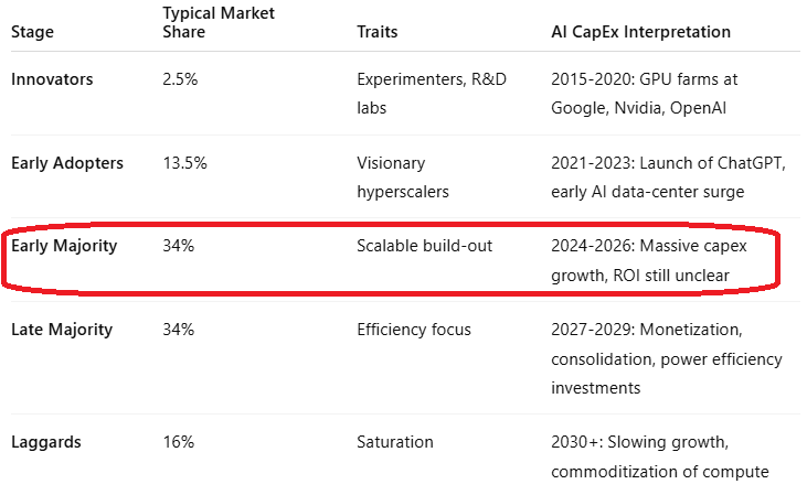 We’re in what Rogers would call the “Early Majority” phase. In fact, we’d call this the “VERY Early Majority” phase of the technology. Very few are using AI in any way other than “powerful Google searches”. It’s just starting to make its way into the mainstream. And as these companies are showing with their spending, massive capex is necessary to move the ball forward.