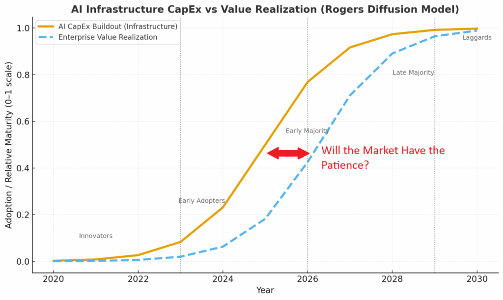The biggest fear in the marketplace is that last statement above regarding the Early Majority phase: “ROI still unclear”. Companies are on pace to spend upwards of 1% of GDP on infrastructure buildout for…what? How will they actually profit from AI? And, more importantly, when will they profit from AI? Investors who are counting on companies to use these investments to generate cashflow are not patient people!
