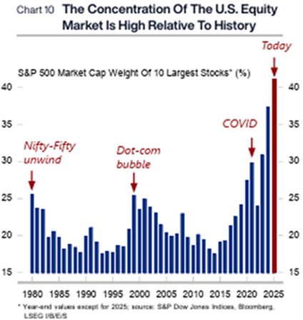 Which is what we need to watch for today. During this gap between massive spending and (hopefully) massive revenue opportunities, risk exists. One bad earnings report from a Google or Microsoft or (God forbid!) Nvidia could have widespread impacts. And those impacts will affect the Average Joe investor much more than they think. A $100 dollar investment in the S&P 500 has more than $40 in just the top 10 names – nine of which are players in AI.