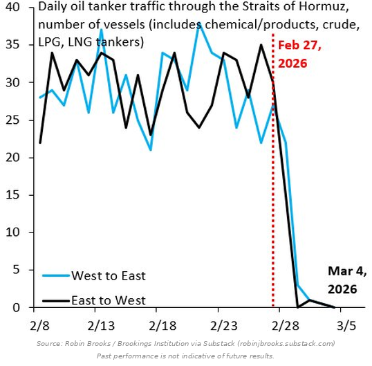 As you know, this all comes down to the Strait of Hormuz and whether oil supply can transit that very narrow piece of water next to Iran’s shores. Last week we told you the real risk to markets wasn’t Iran’s navy, it was whether shipping companies and their insurers would take the risk. We now know the answer: they won’t. As former IIF Chief Economist Robin Brooks pointed out this week, shipping traffic through the Strait has collapsed to near zero.