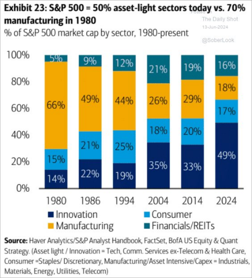 In 1980, nearly 2/3 of the S&P 500 was made up of manufacturing companies. Today that number is just 18%. Just 14% of the market was made up of “innovation” companies (i.e., tech). Today that number is 49%.